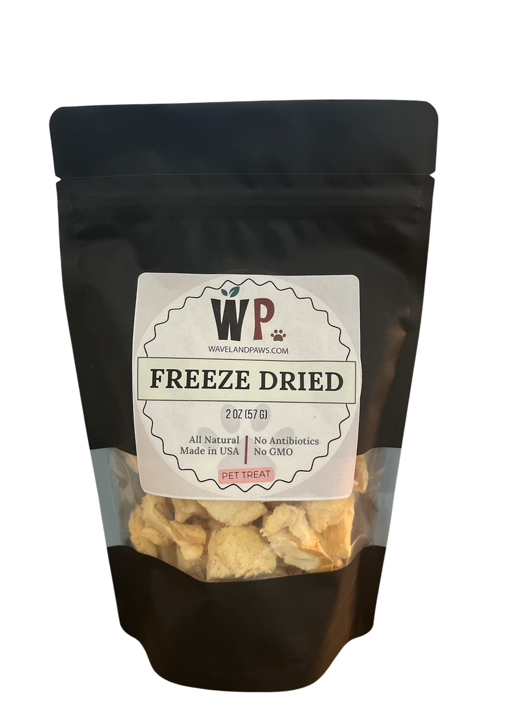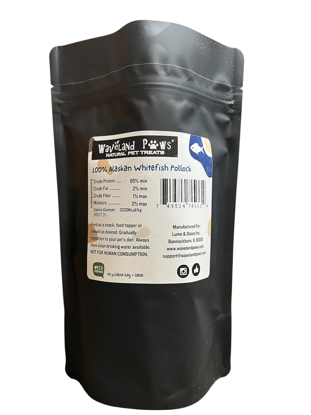Waveland Paws Freeze Dried White Alaskan Whitefish is a single ingredient treat or food topper good for dogs and cats.